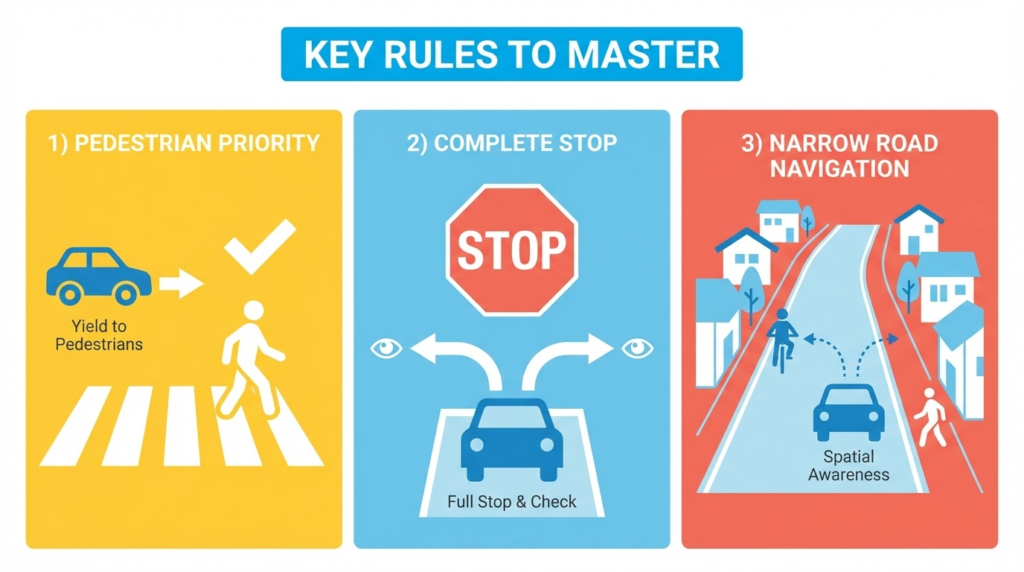 試験において、単なる道路標識の暗記だけでは不十分な場面が増えるでしょう。2025年の改正ポイントを踏まえ、特に以下の3つのルールを深く理解しておくことが合格への近道です。